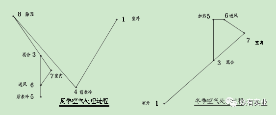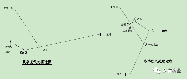 此系統(tǒng)中,夏季:溫度為 Tw 濕度為 RHw 的室外風(fēng)經(jīng)與室內(nèi)風(fēng)經(jīng)一次回風(fēng)混合后,達(dá)到某一狀態(tài)點(diǎn)3,進(jìn)入轉(zhuǎn)輪除濕機(jī),其出風(fēng)狀態(tài)點(diǎn)為 4(Rho 小于 4%,T 達(dá)到 43℃左右),然后再經(jīng)過(guò)表冷器干冷處理后達(dá)到狀態(tài)點(diǎn) 5,經(jīng)風(fēng)機(jī)溫升達(dá)到狀態(tài)點(diǎn) 6 后送入室內(nèi),以保證室內(nèi)狀態(tài)參數(shù) Tn,RHn。冬季:溫度為 Tw, 濕度為 RHw 的室外風(fēng)經(jīng)與室內(nèi)風(fēng)經(jīng)一次回風(fēng)混合后,達(dá)到某一狀態(tài)點(diǎn) 3,取一部分回風(fēng)進(jìn)入轉(zhuǎn)輪除濕機(jī),其出風(fēng)狀態(tài)點(diǎn)為 4(Rho 小于 4%,T 達(dá)到 43℃左右),再與未經(jīng)過(guò)除濕機(jī)的回風(fēng)經(jīng)二次回風(fēng)混合后達(dá)到混合點(diǎn) 6,然后經(jīng)蒸汽加熱器處理后達(dá)到狀態(tài)點(diǎn) 7,經(jīng)風(fēng)機(jī)溫升達(dá)到狀態(tài)點(diǎn) 8 后送入室內(nèi),以保證室內(nèi)狀態(tài)參數(shù) Tn,RHn。此類系統(tǒng)可以提供 RHn=2%~30%的環(huán)境參數(shù),常用于濕度要求較高的系統(tǒng)。