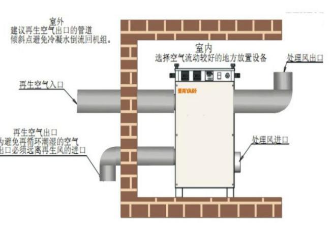 除濕機(jī)置于室外:干空氣出口和處理空氣進(jìn)口連接到除濕區(qū)域。再生風(fēng)入口和濕空氣出口不需要連 接管道。