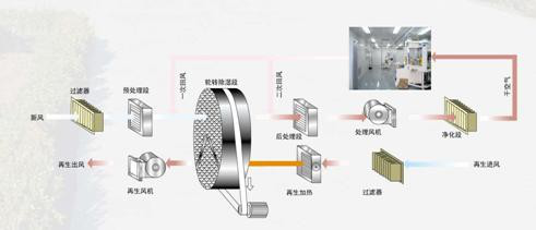 轉(zhuǎn)輪除濕機的工作流程可分幾個部分完成:預(yù)冷 / 預(yù)熱( 供選件 ) — 轉(zhuǎn)輪除濕 —后冷 / 后熱( 供選件 )