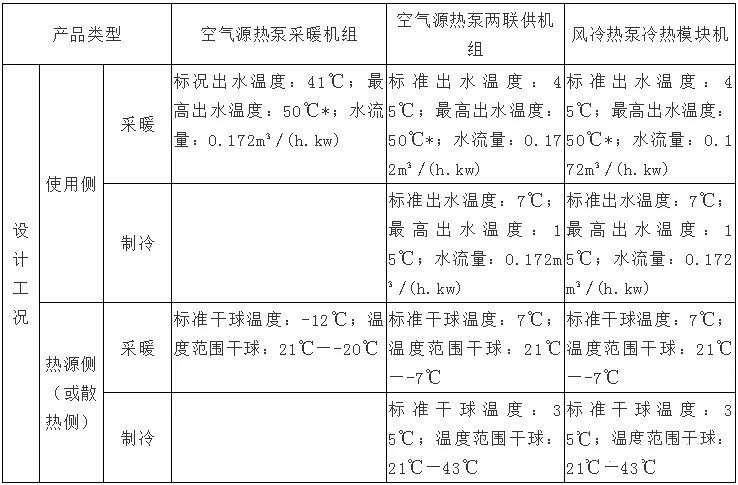 其實,對于空氣源熱泵兩聯(lián)供機組來說現(xiàn)在市場上一般會按使用區(qū)域不同分為低溫機和常溫機,低溫機也參照GB/T25127.1或GB/T25127.2常溫機參照表中所列。