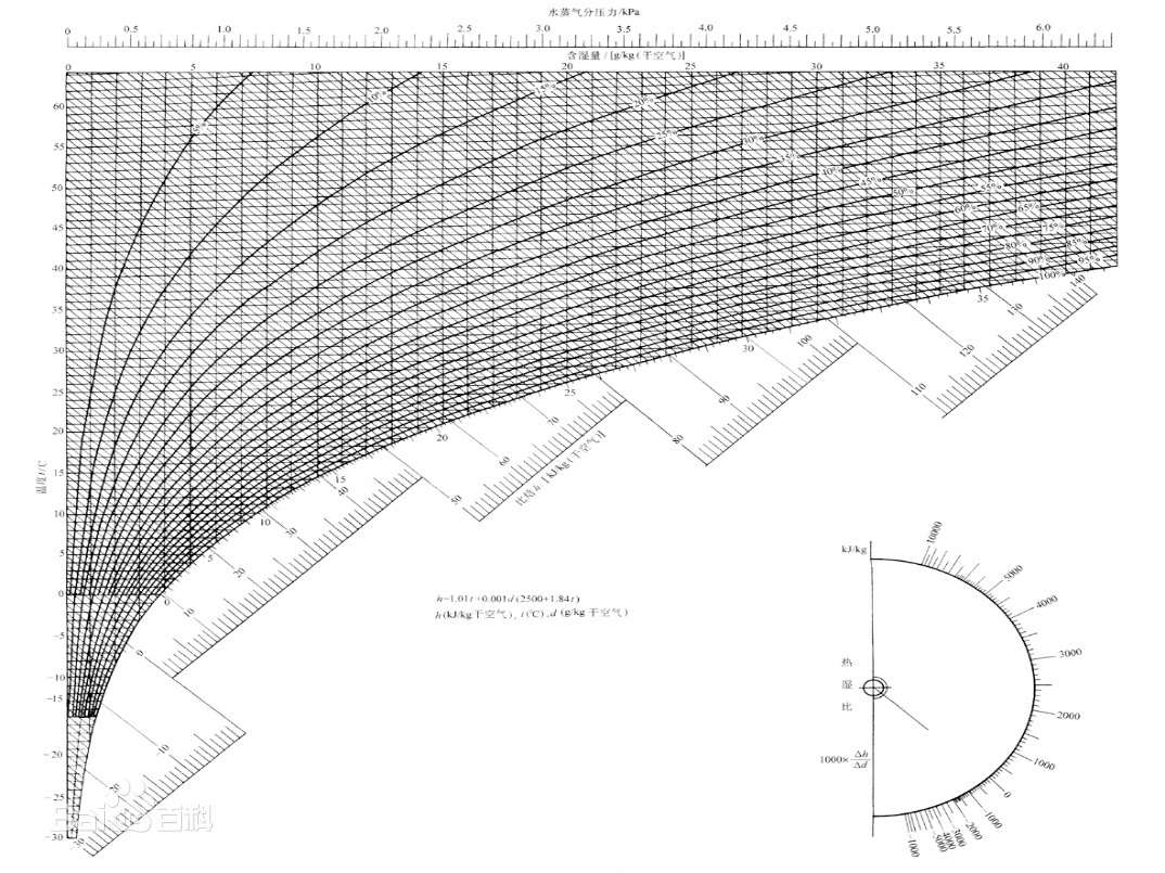 下圖為濕空氣焓濕圖(部分)的示意圖(圖片來源百度百科)。 該圖是以1kg干空氣的濕空氣為基準繪制的。不同大氣壓的焓濕圖是不同的。焓濕圖上有幾種等值參數(shù)線:等焓(h)線—與縱坐標成135°角的直線;等含濕量(d)線—平行縱坐標軸的直線;等干球溫度(t)線—近似水平的直線;等相對濕度(Ø)線—圖中的曲線;等濕球溫度線近似與等焓線平行,圖中未表示;水蒸氣分壓力(pw)與d成單值函數(shù)關(guān)系,其值表示于d的上方,等pw線平行于等d線;圖的右下方給出了熱濕比ε的方向線,熱濕比又稱角系數(shù)。