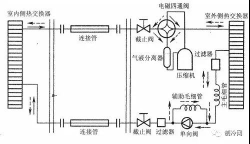 3、熱泵系統(tǒng) 。與單冷系統(tǒng)情況相同,熱泵運(yùn)行是否正常,主要檢查四通換向閥的工作情況。換向閥換向時(shí),可聽(tīng)到有比較響的氣體流動(dòng)聲以及電磁閥頂針的撞擊聲(電磁場(chǎng)吸動(dòng)閥心),當(dāng)電磁閥在換向過(guò)程中聽(tīng)不到上述兩種聲音,那電磁閥可能出故障。