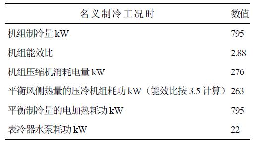 該測試系統(tǒng)在測試時,運(yùn)用表冷器能夠使得冷熱量自平衡,最大限度地利用風(fēng)冷冷(熱)水機(jī)組使用側(cè)的冷量與熱源側(cè)的熱量交換,熱源側(cè)的熱量被使用側(cè)的冷量平衡后剩余的只有壓縮機(jī)的功率這部分熱量需要通過冷卻設(shè)備散去,并不需要消耗大量的能量來單獨(dú)平衡使用側(cè)產(chǎn)生的冷量和熱源側(cè)產(chǎn)生的熱量。而且風(fēng)冷冷(熱)水機(jī)組的能效比越高,同等制冷量下,需要測試系統(tǒng)散去的壓縮機(jī)功率也就越少,測試系統(tǒng)也越節(jié)能。以800kW風(fēng)冷冷(熱)水機(jī)組制冷為例,表冷器的運(yùn)用對測試系統(tǒng)的耗能比較見表1。