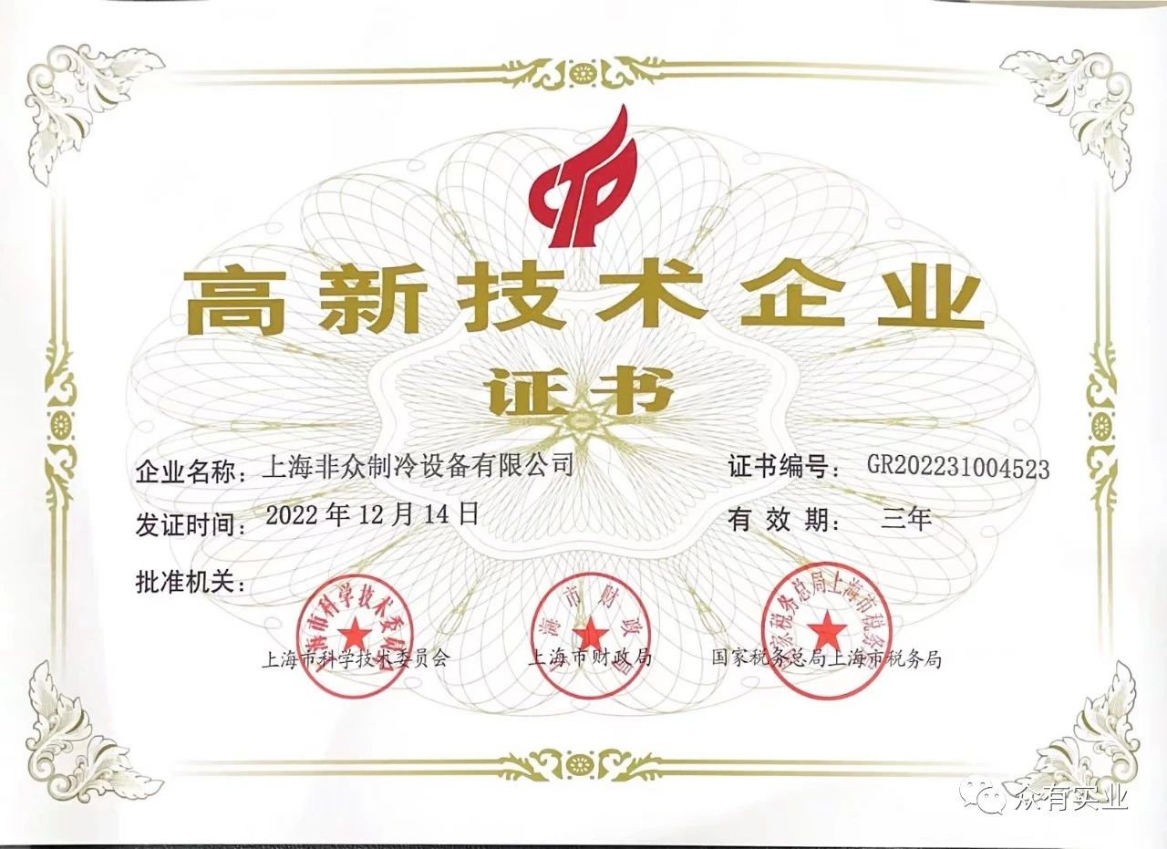 獲得高新技術企業(yè)認證,證明了非眾制冷在本領域中具有較強的技術創(chuàng)新能力、技術開發(fā)能力。