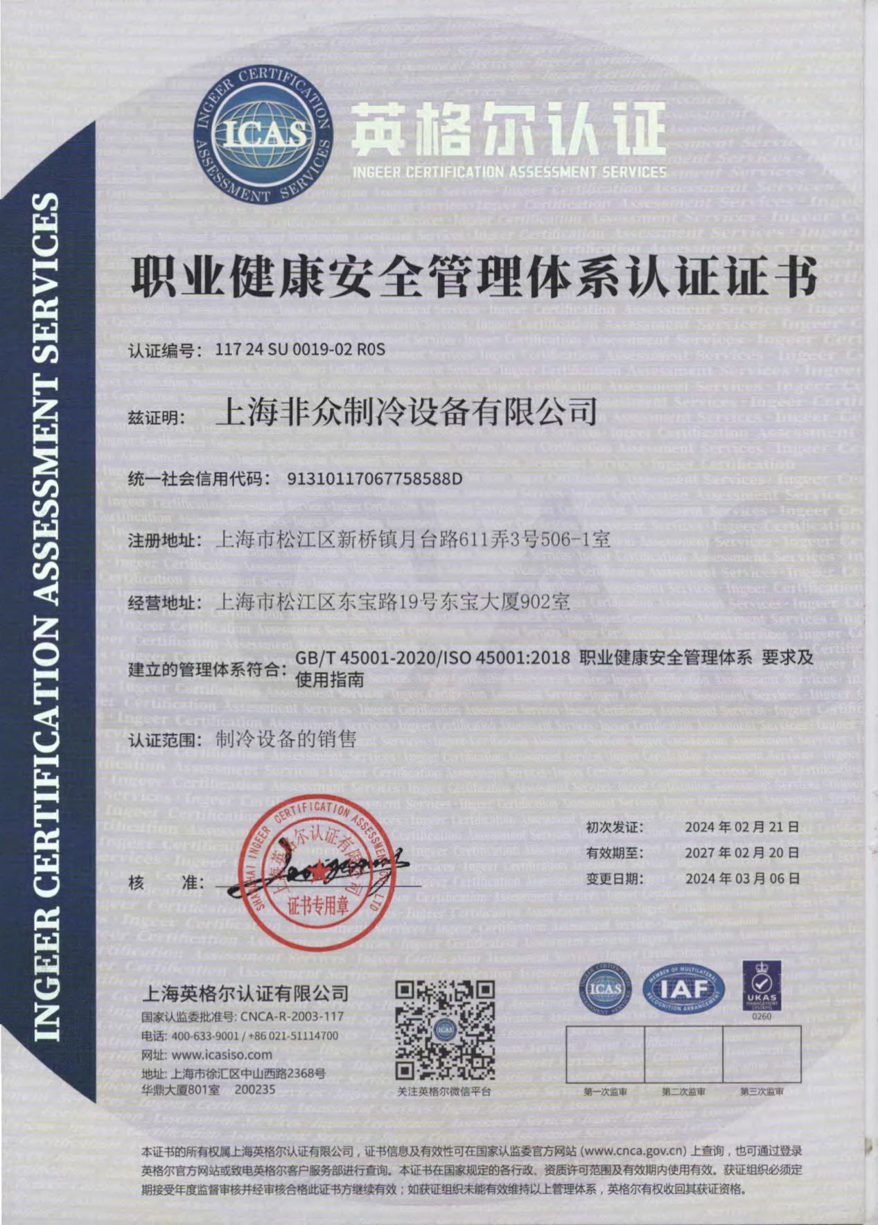 職業(yè)健康安全管理體系認(rèn)證則是對(duì)企業(yè)關(guān)注員工健康、保障員工權(quán)益的有力證明。上海非眾制冷設(shè)備有限公司始終將員工的生命安全和身體健康放在一位,通過(guò)建立完善的安全管理制度和應(yīng)急預(yù)案,確保員工在工作中能夠享受到安全、健康的環(huán)境。公司定期開(kāi)展安全培訓(xùn)和演練,提高員工的安全意識(shí)和自救互救能力,有效預(yù)防和減少了職業(yè)傷害事故的發(fā)生。