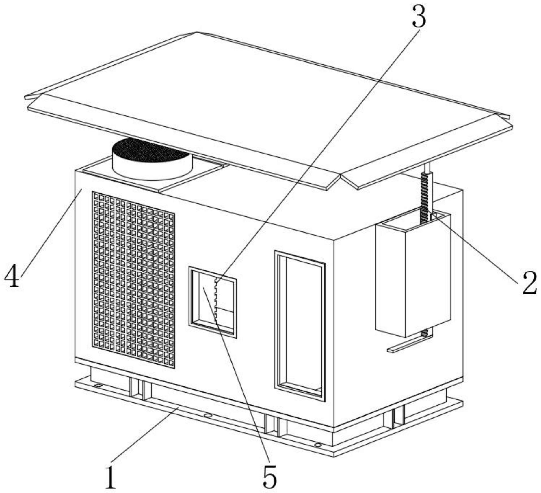 一體式的屋頂空調(diào)機(jī),專利號:ZL 2024 2 0258431.7,涉及空調(diào)技術(shù)領(lǐng)域,而本實(shí)用新型包括槽鋼底座,槽鋼底座的頂端固定連接有空調(diào)機(jī)本體,空調(diào)機(jī)本體的內(nèi)部設(shè)置有散熱片,空調(diào)機(jī)本體的上內(nèi)壁設(shè)置有配合散熱片使用的清理組件,空調(diào)機(jī)本體的一端上部設(shè)置有防雨組件,防雨組件包括連接殼,連接殼的一端與空調(diào)機(jī)本體的一端上部固定連接,連接殼的一側(cè)內(nèi)壁固定連接有第一支座,第一支座的頂端固定連接有第一電機(jī),且第一電機(jī)的輸出端固定連接有第一錐齒輪,本實(shí)用新型通過設(shè)置防雨組件,起到便于使得空調(diào)機(jī)具有防水功能的作用,提高了空調(diào)機(jī)的實(shí)用性,通過設(shè)置清理組件,起到便于對空調(diào)機(jī)中的散熱片表面灰塵進(jìn)行清理的作用,提高了空調(diào)機(jī)的使用效果。