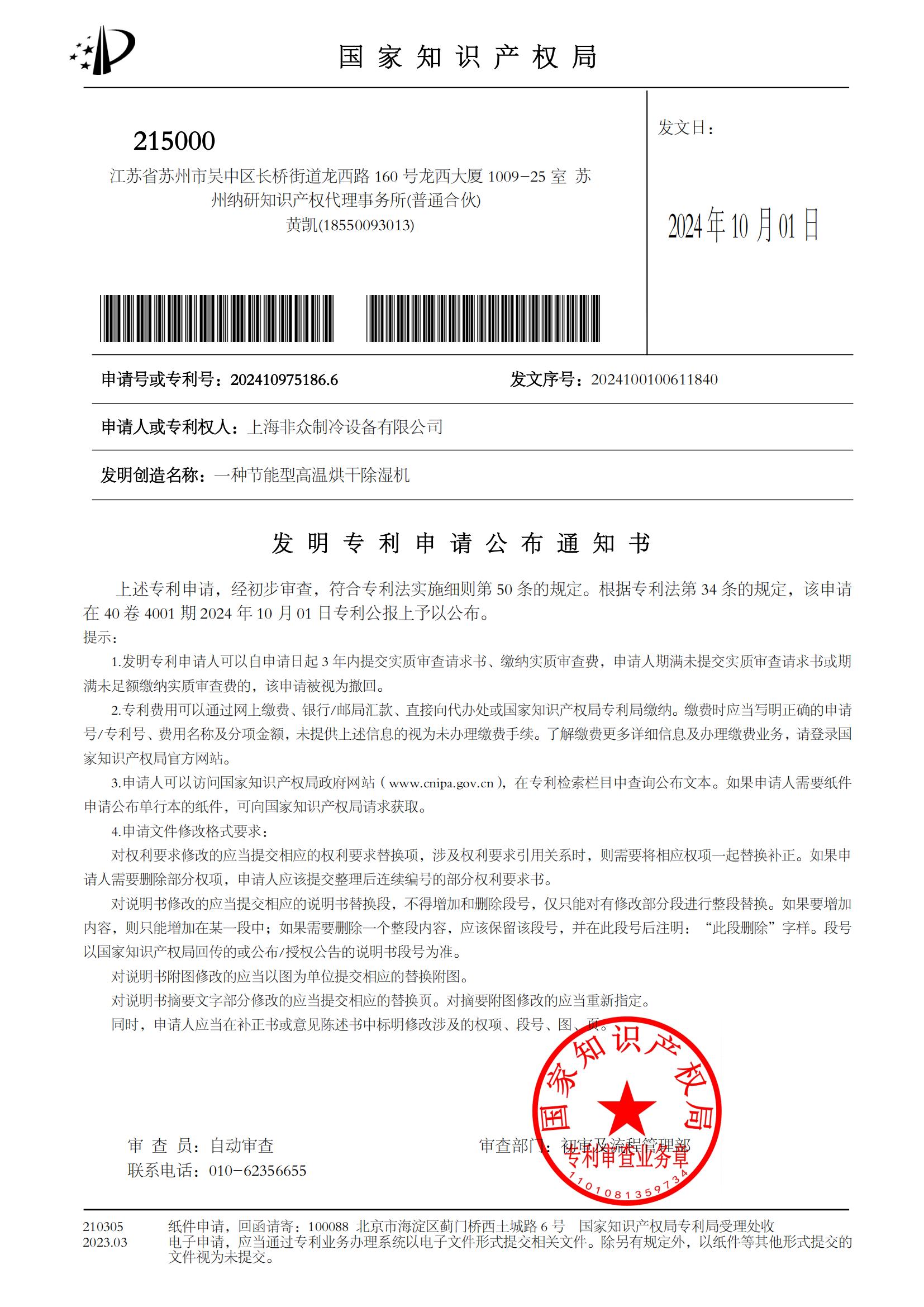 熱烈祝賀上海非眾制冷“一體式的屋頂空調(diào)機(jī),專利號:ZL 2024 2 0258431.7”實(shí)用新型專利獲得國家知識產(chǎn)權(quán)局授權(quán),取得專利證書并申請公布發(fā)明專利“ 一種節(jié)能型高溫烘干除濕機(jī),申請?zhí)柣驅(qū)@枺?/span>202410975186.6 ”