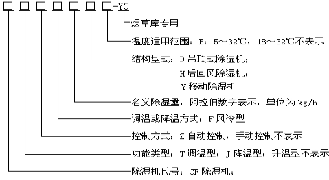 型號示例: CFZF20-YC 表示名義除濕量為20kg/h,進(jìn)風(fēng)溫度18~32℃,固定式自動調(diào)溫型煙草庫專用除濕機(jī)組。