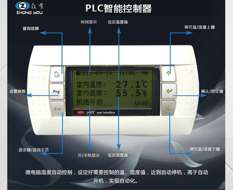 機組采用了專用的微電腦控制,可根據(jù)用戶設定的相對濕度自動啟停、精度高、可靠性好、外形美觀、操作簡便。