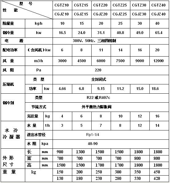 水冷調(diào)溫型管道除濕機技術(shù)指標(biāo):
