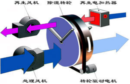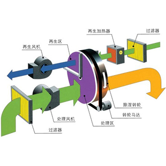 同時,在再生區(qū)域,另一路空氣先經過再生加熱器后,變成高溫空氣(一般為100~140度)并穿過吸濕后的轉輪,使轉輪中已吸附的水份蒸發(fā),從而再生空氣因水份的蒸發(fā)而變成濕空氣,同時溫度下降;之后,再通過再生風機將濕空氣排除到室外。