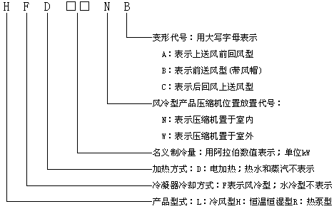 型號舉例:HF19N 表示名義制冷量為19kW的壓縮機置于室內(nèi)的風(fēng)冷型單元式空調(diào)機組。